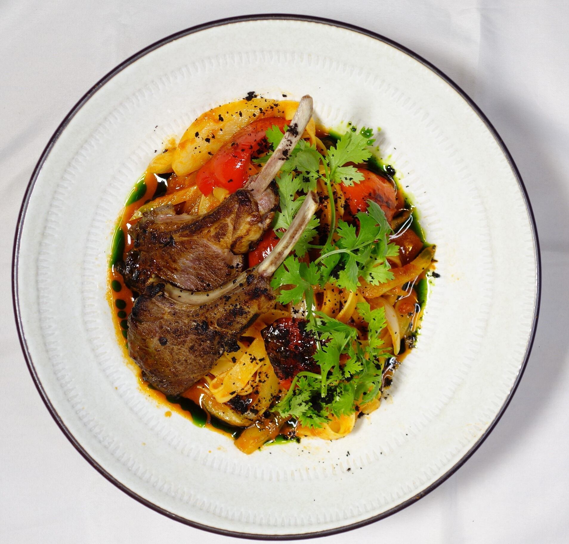 ウズベキスタンのパスタ、ナスのピクルスサラダ添え